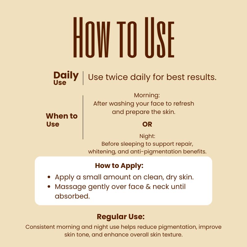 You should apply it in the Morning, after washing or cleansing your face, to refresh and prepare the skin for further skincare. OR, apply it at Night before sleeping, to support repair, anti-ageing, and skin rejuvenation benefits. Nighttime use may also support whitening, and anti-pigmentation benefits.